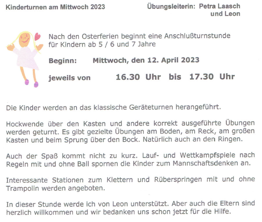 Der TuS Barendorf bietet Kinderturnen an. Es gelten folgende Zeiten: